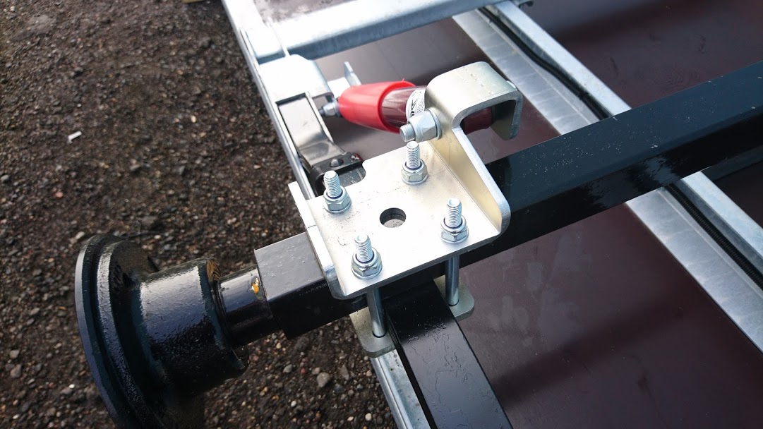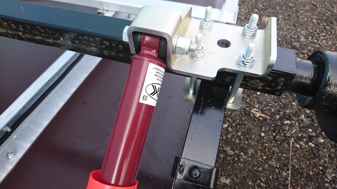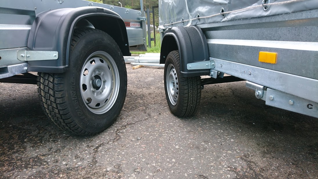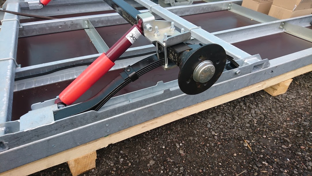 Подвеска рессорно-амортизаторная (с гидравлическими телескопическими амортизаторами), состоит из оцинкованного жесткосваренного подрамника, двух четырехлистовых рессор со скользящим концом, двух амортизаторов и оси. Ось изготовлена из толстостенной квадратной трубы 50*50*4 мм и ступицы немецкой фирмы Knott. Ступица не нуждается в техническом обслуживании. Подшипник компактный, двухрядный, шариковый с наклонными дорожками.