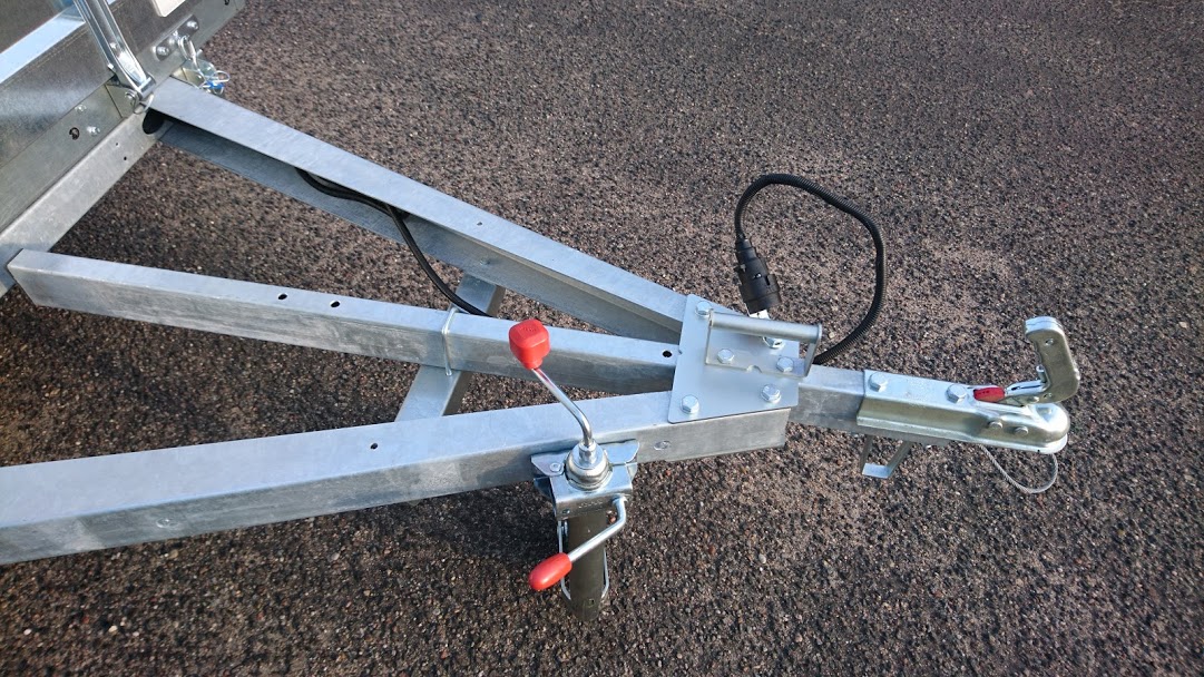 У усиленного «А» образного дышла имеется возможность удлинения на 600 мм. Крепление дышла к раме осуществляется с помощью болтов через соединительный узел толщиной 6 мм. Все прицепы оборудованы механизмом наклона кузова, который фиксируется двумя усиленными замками-защелками с R-образными шплинтами и регулировкой натяжения с максимальной нагрузкой до 700кг.