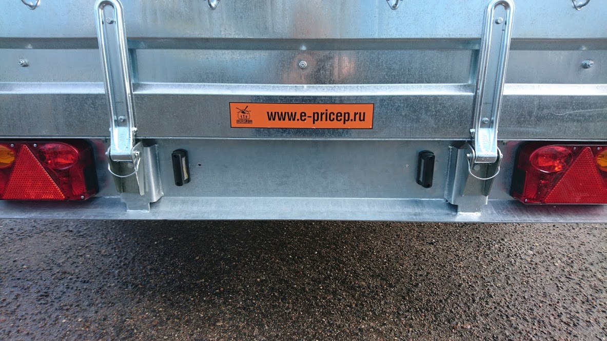 Светотехника расположена внутри заднего усиленного противоударного бампера (толщина металла 3 мм, ребра жесткости), имеющего специальный профиль (при езде по бездорожью не гребет кочки, а скользит как лыжа). Такого бампера нет ни у одного производителя прицепов. Пол из 9 мм транспортной ламинированной фанеры с сетчатым противоскользящим покрытием. Имеются петли для крепления груза (такие как на фурах).