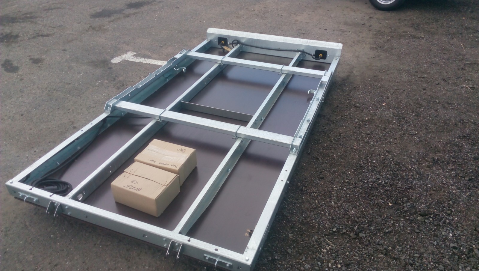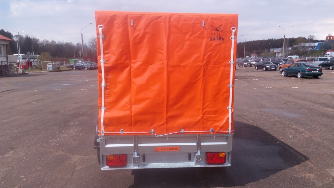 Светотехника расположена внутри заднего усиленного противоударного бампера (толщина металла 3 мм, ребра жесткости), имеющего специальный профиль (при езде по бездорожью не гребет кочки, а скользит как лыжа). Такого бампера нет ни у одного производителя прицепов. Пол из 9 мм транспортной ламинированной фанеры с сетчатым противоскользящим покрытием. Имеются петли для крепления груза (такие как на фурах).