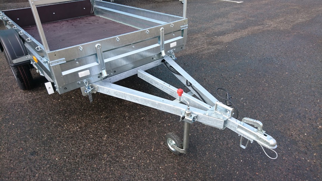 У усиленного «А» образного дышла имеется возможность удлинения на 600 мм. Крепление дышла к раме осуществляется с помощью болтов через соединительный узел толщиной 6 мм. Все прицепы оборудованы механизмом наклона кузова, который фиксируется двумя усиленными замками-защелками с R-образными шплинтами и регулировкой натяжения с максимальной нагрузкой до 700кг.